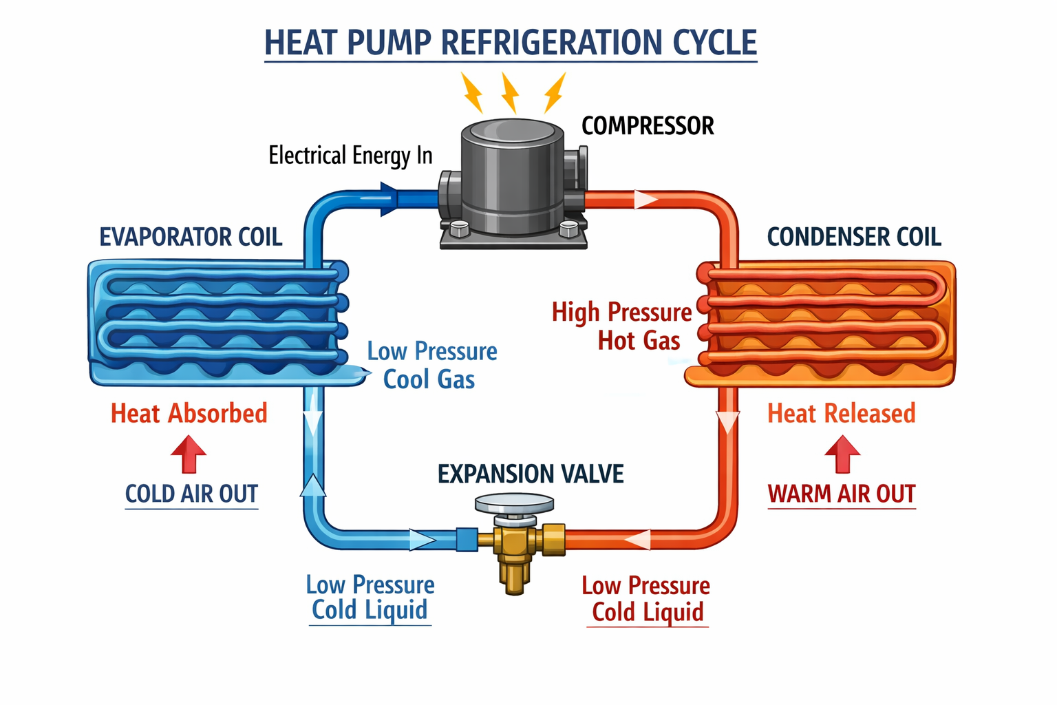 • Expansion Device: Reduces pressure and temperature, preparing the refrigerant to absorb heat again.